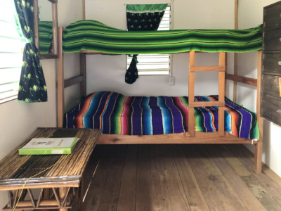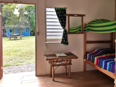 Our bunkhouses are quaint, clean, and comfortable wooden cabins that can host groups or individuals in a mixed (or gender specific by request) dormitory setting. Katydid has one larger and two smaller rooms (each with 4 beds). Shared showers and toilets are detached from the cabin. The beds are bunk-bed style. This bunkhouse has a small veranda with deck furniture. Email us for group (8+ people) bookings and reduced per person rates.